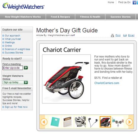 Posted on May 3, 2011 by PRWChariot Carriers on Weight Watcher’s Gift Guide A Chariot Carrier for Mom’s Day would bring smiles all around. Happy mom, happy bambino (or 2) & happy you! Like Loading... Related