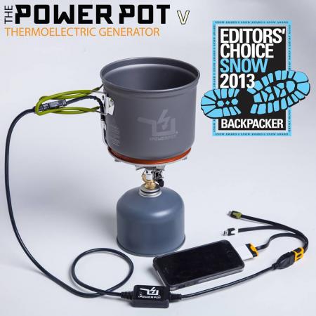 The PowerPot V is a portable thermoelectric generator. It serves as both a power source for USB devices and a cooking pot for preparing soup, tea or MREs. It uses thermoelectric technology to convert excess heat into electricity while cooking.