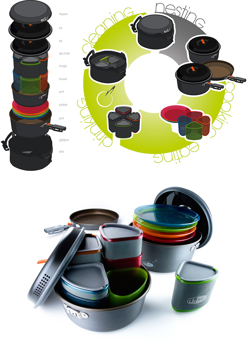 Pack space for campers is at a premium, of course, and GSI’s designers have done more than prevent one from having to carry oven mitts. Their Pinnacle set, an “integrated cooking and eating solution,” packs an absurd amount of dining items into a compact space: