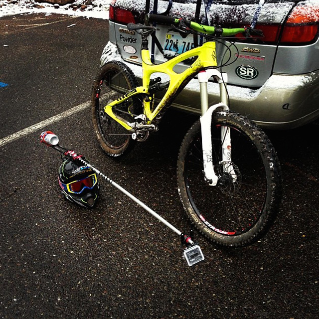 When I’m shooting my POV stuff, I’m often out alone. Particularly if I’m using some really dorky mount, like the Narwhal cam protruding from my helmet. That Narwhal cam involved strapping a 150-centimeter aluminum cross-country ski pole to the top of the helmet and attaching an L-bracket on the back of the helmet, into which I put a 24-ounce PBR tall boy as a counterweight. After all, you gotta have something to drink at the end. Any time I went out with that thing, it was on a shitty weather day so I wouldn’t run into anybody else on the trail. Because I just looked like a total goober. And I only rode the trails I knew super well and could ride smoothly so that the footage had the best chance of coming out well.