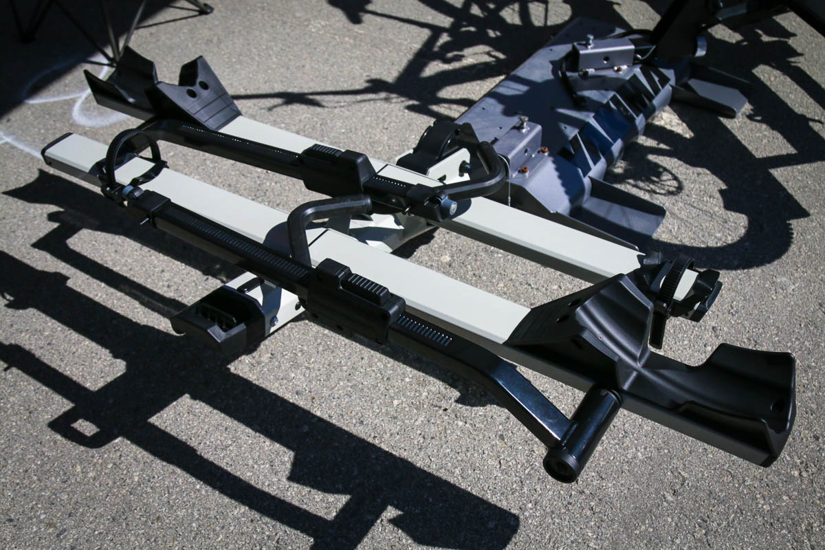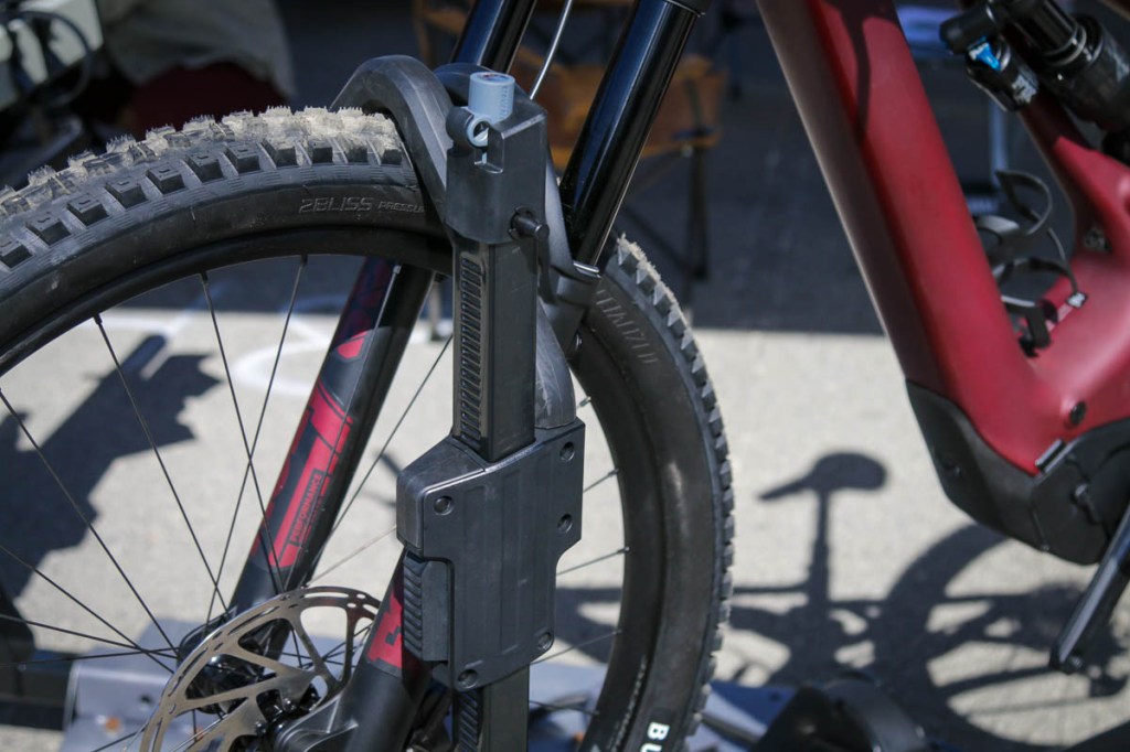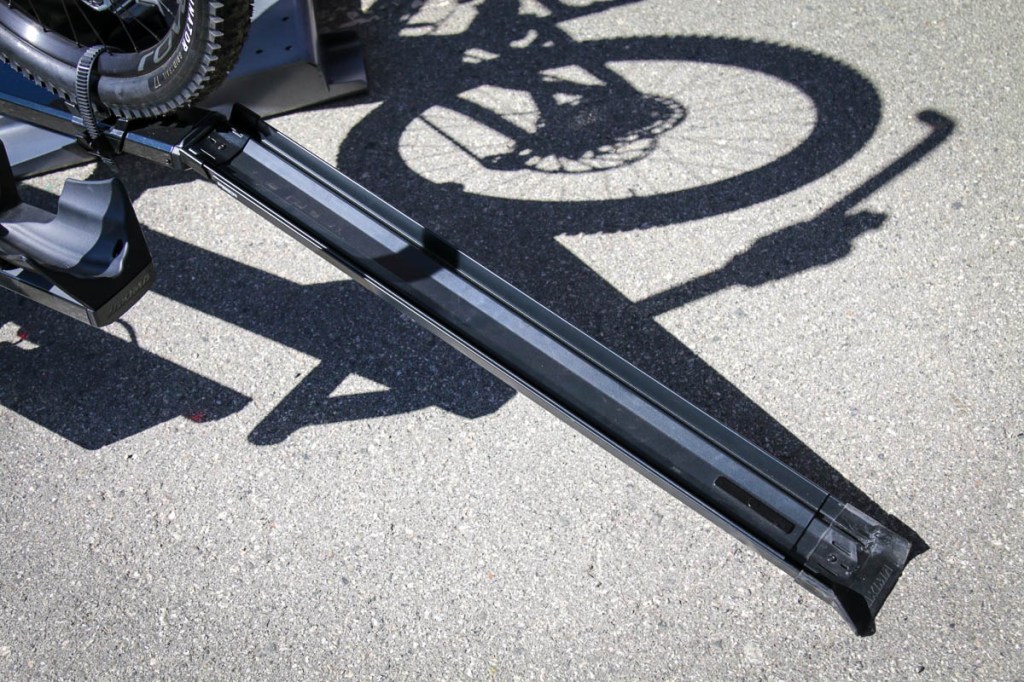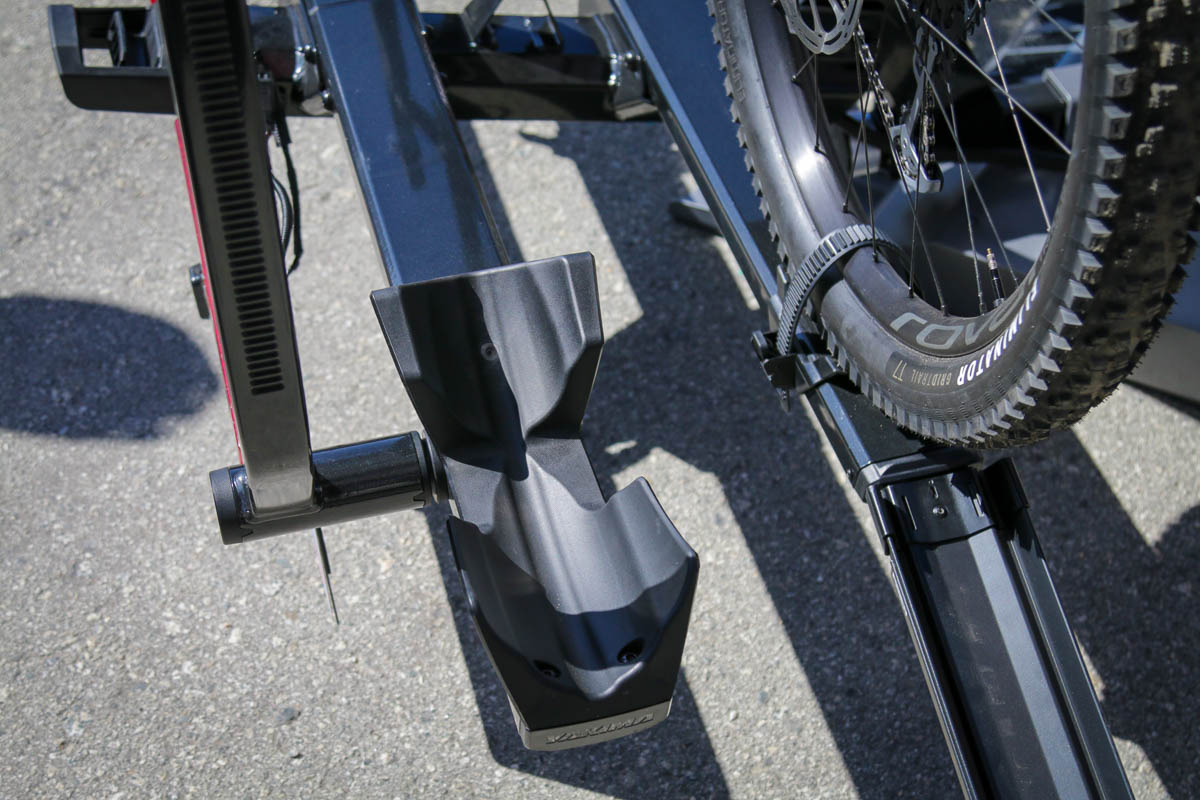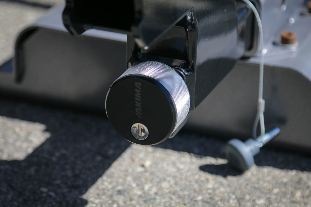 The Yakima HighSpeed is a fork-mounted rooftop bike rack. That means you’ll need to remove the front wheel. With the wheel removed, there is a clamp that grabs the front axle and tightens down until it clicks. It works with thru-axles and there’s an adapter for quick-release bikes that essentially turns the quick release into a thru-axle. One detail about that is you will need a thru-axle with a consistent width from side to side that easily stays with the frame. Some systems, such as those from Mavic might have you buying an extra thru-axle. With that sorted, the rear wheel stays on and there’s a strap that holds it tight to the rack. That strap could use a bit of extra padding for fancy carbon wheels but it keeps things secure and while removing the front wheel is extra work, it keeps the bike lower when installed and means fenders aren’t an issue.