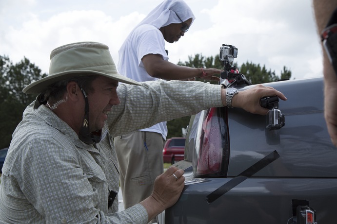 Photo Caption: Shane Hurlbut, ASC Cinematographer on Need for Speed, oversees the mounting of GoPro cameras on set