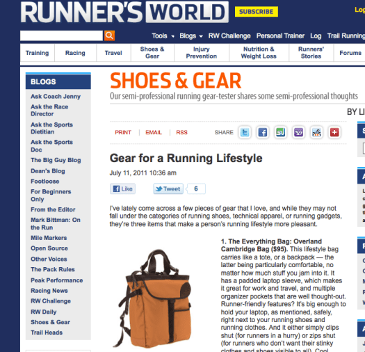 The Overland Cambridge bag is on a roll!! Check out this review for the Overland Cambridge in Runners World “Gear for a Runners Lifestyle.” (click image for link) Get more info on the Cambridge and all other Overland Equipment bags at the link below.