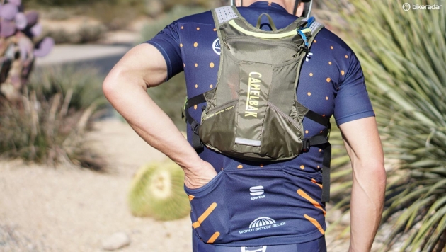 The 4L pack sits high on the back, so you can still reach your jersey pockets